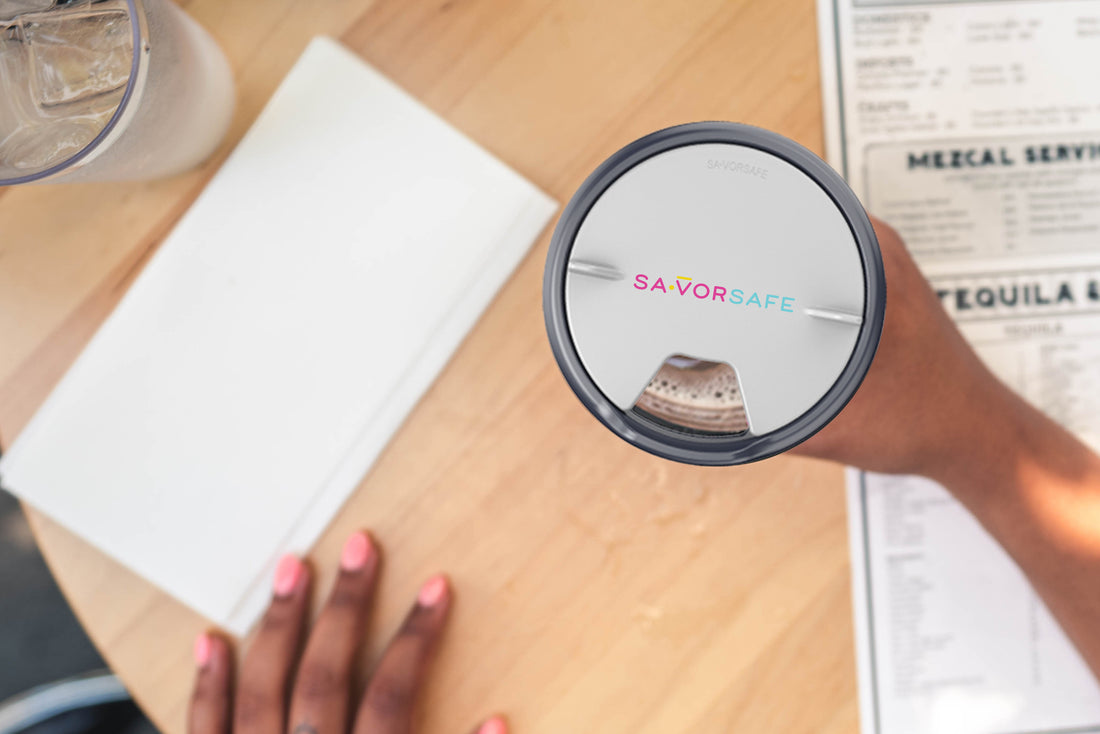 The Savor Safe beverage lid is a customizable accessory designed to fit various glass sizes, providing a safer drinking experience by preventing contaminants from entering your beverage.